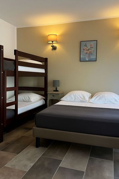 Cette chambre pour 4 Personnes de 17 m2 équipée d'un Grand Lit Double et de 2 Lits superposés offre une vue sur la pinède environnante.